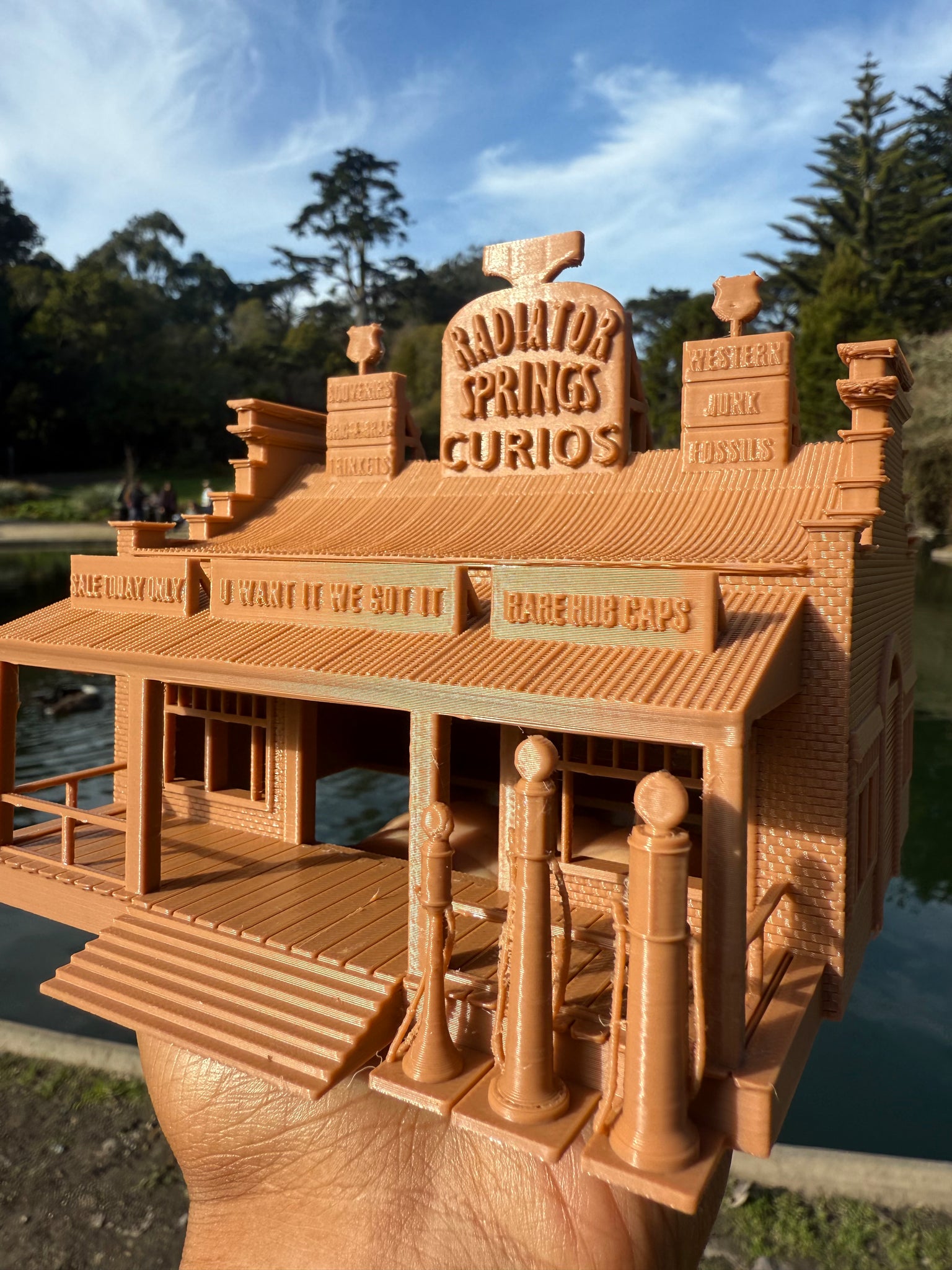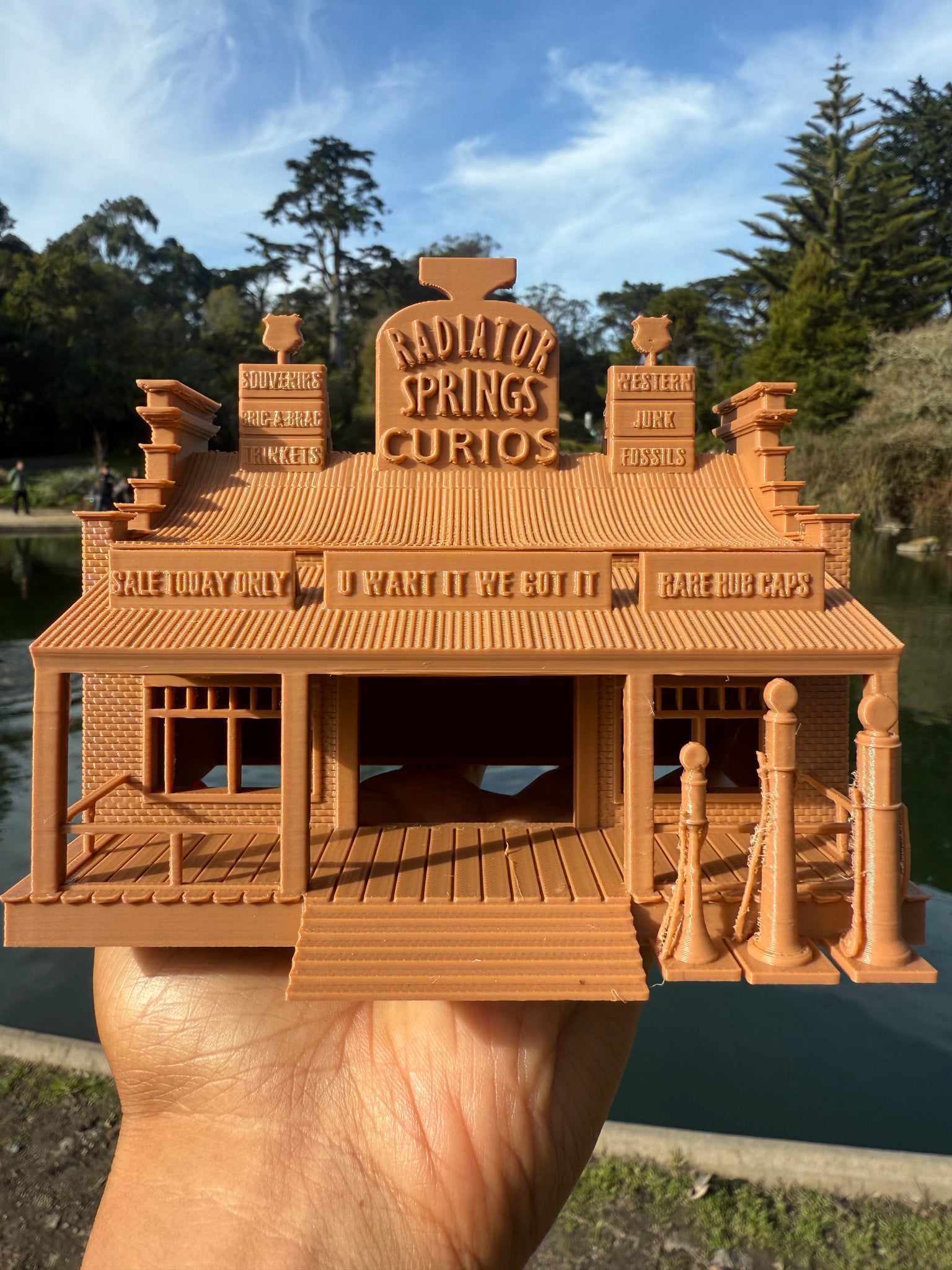 • Real-World Origins: The design is a "greatest hits" of famous Route 66 stops. It draws heavily from the Sandhills Curiosity Shop in Erick, Oklahoma (for its cluttered, sign-covered facade) and the Hackberry General Store in Arizona (for its vintage gas pumps and rusted memorabilia).