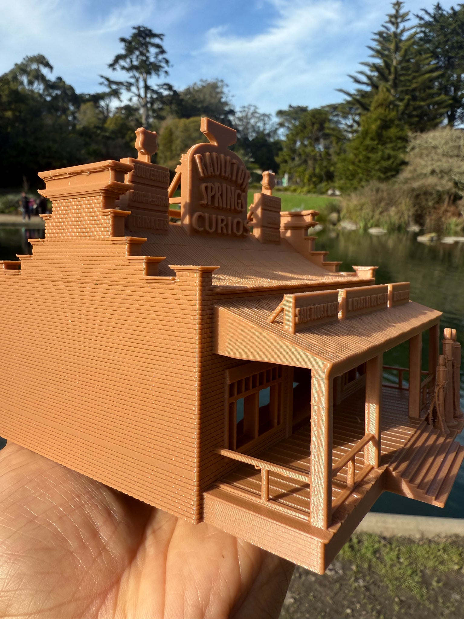 Gold Rush Bay Ready Built miniature HO-Scale Radiator Route 66 Curios Shop Model Building Measures 5.5 inch wide by 5.5 inches deep by 5 inches tall.