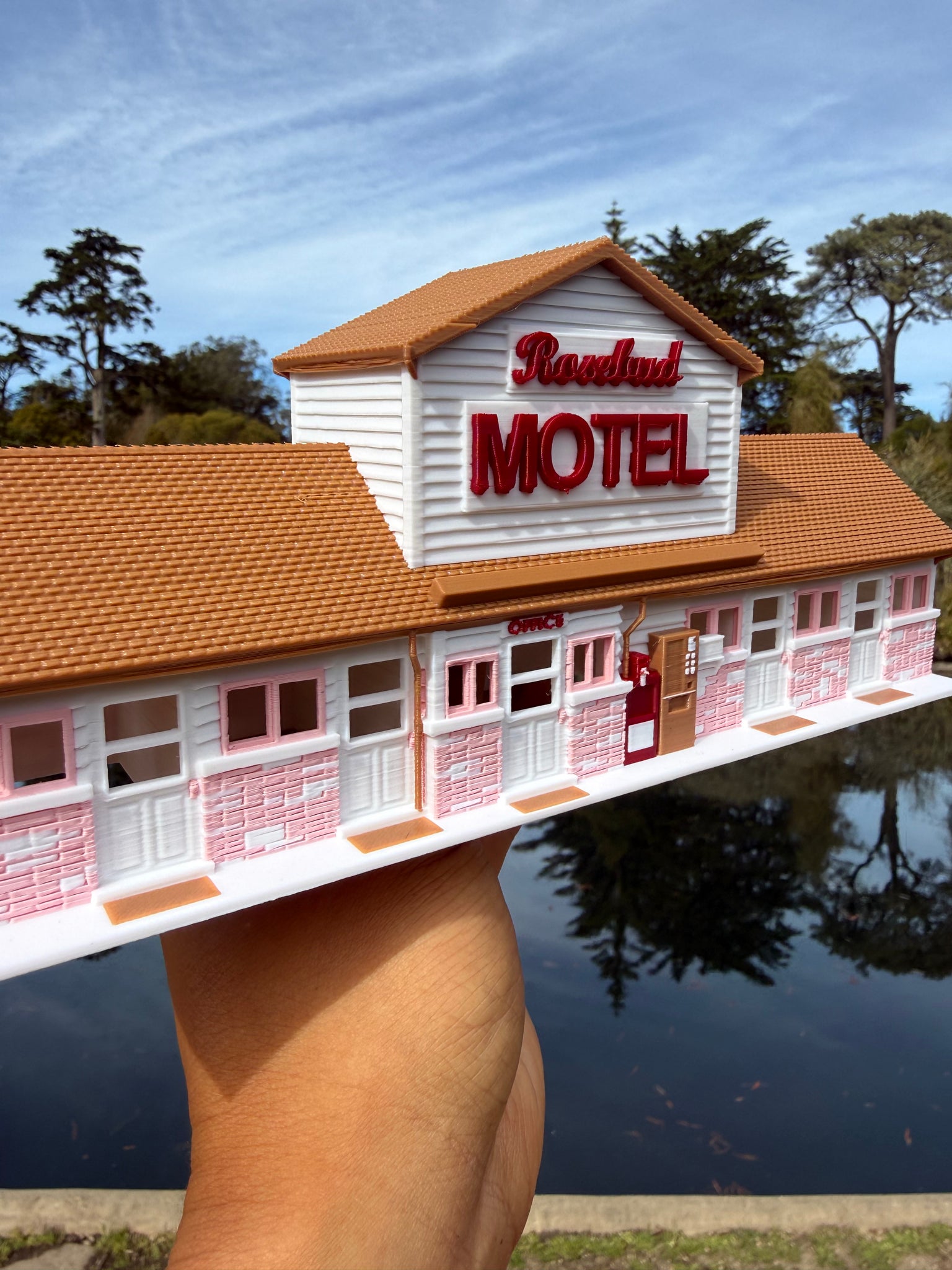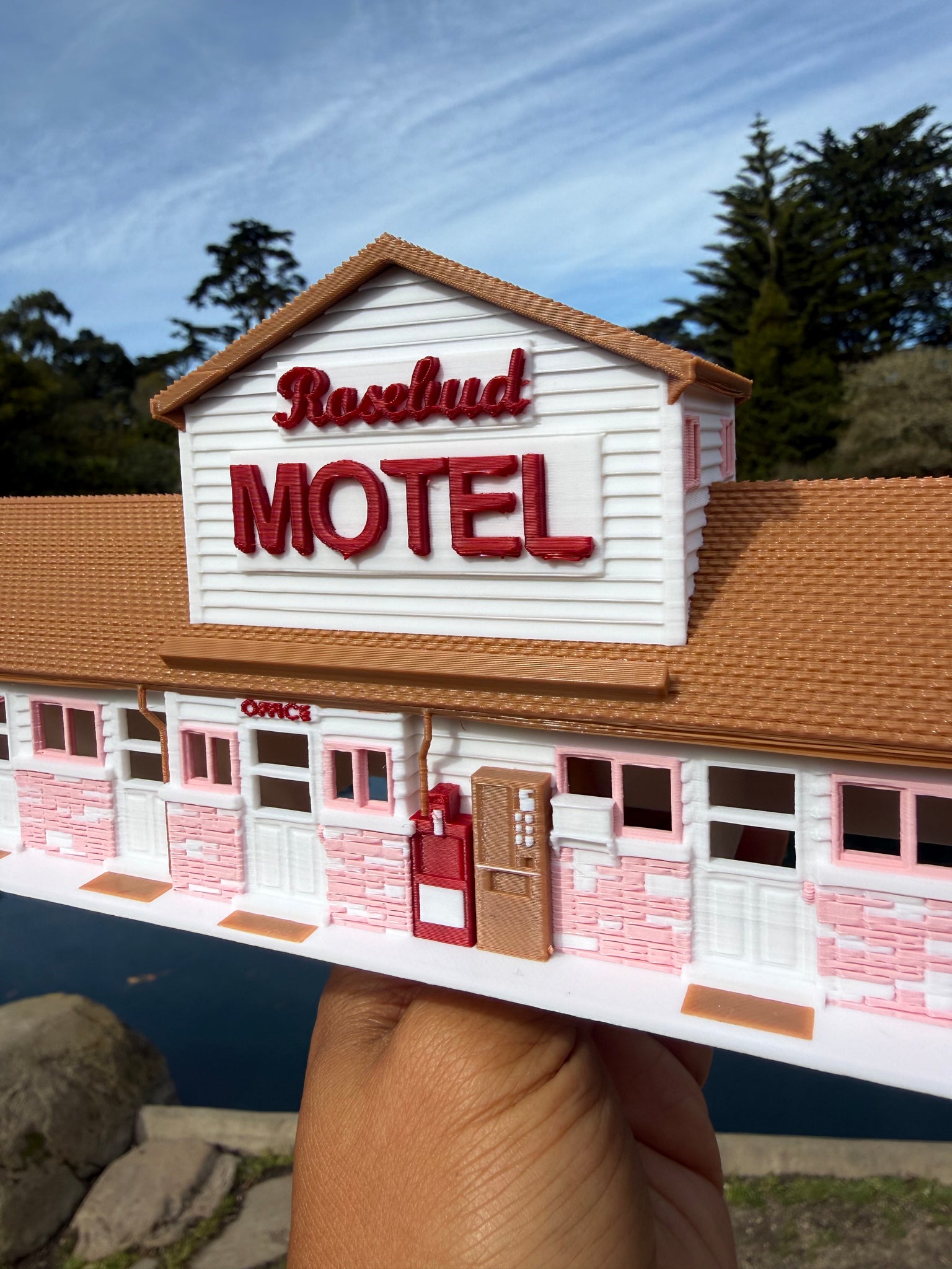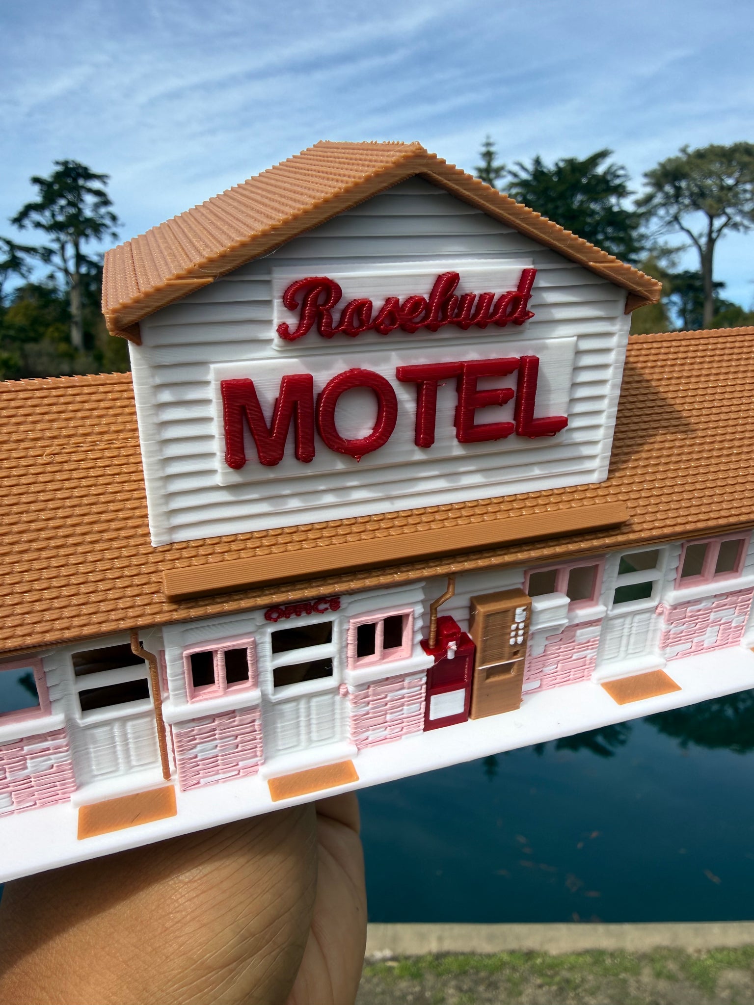 Fold in the cheese, then fold in this miniature motel into your collection! Gold Rush Bay Ready Built miniature Color HO-Scale Rosebud Motel Building. Measures 9 inch wide by 3 inches deep by 4 inches tall. Candle flowers and card not included.
