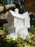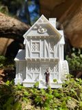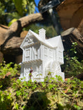 Introducing a beautiful paintable 3 Witches’ Magic Cottage House from Gold Rush Bay. The Cottage is beautifully modeled after New England Wood Timber framed constructed houses. A generous porch surrounds the house envelope. There are minute details such as a flower and potions conservatory and even a small eye shaped window surprise! The exterior is White color for easy painting with most acrylics or modeling paints. The entire structure measures 4 inches wide 5 inches deep and 6 inches high. Figures not included, house only.