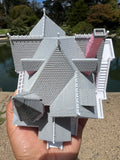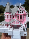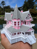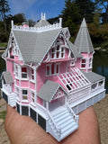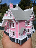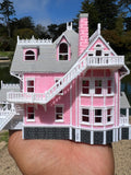 Introducing a beautiful paintable Pink Palace Victorian House from Gold Rush Bay. The Mansion is modeled after Victorian apartment architecture with. A generous porch surrounds the house envelope. There are minute details such as conical tower, pediment flourishes and winding staircases! The exterior is pink white and gray colors and can easily be touch up painted with most acrylics or modeling paints. The entire structure measures 4.5 inches wide 5.5 inches deep and 5 inches high.